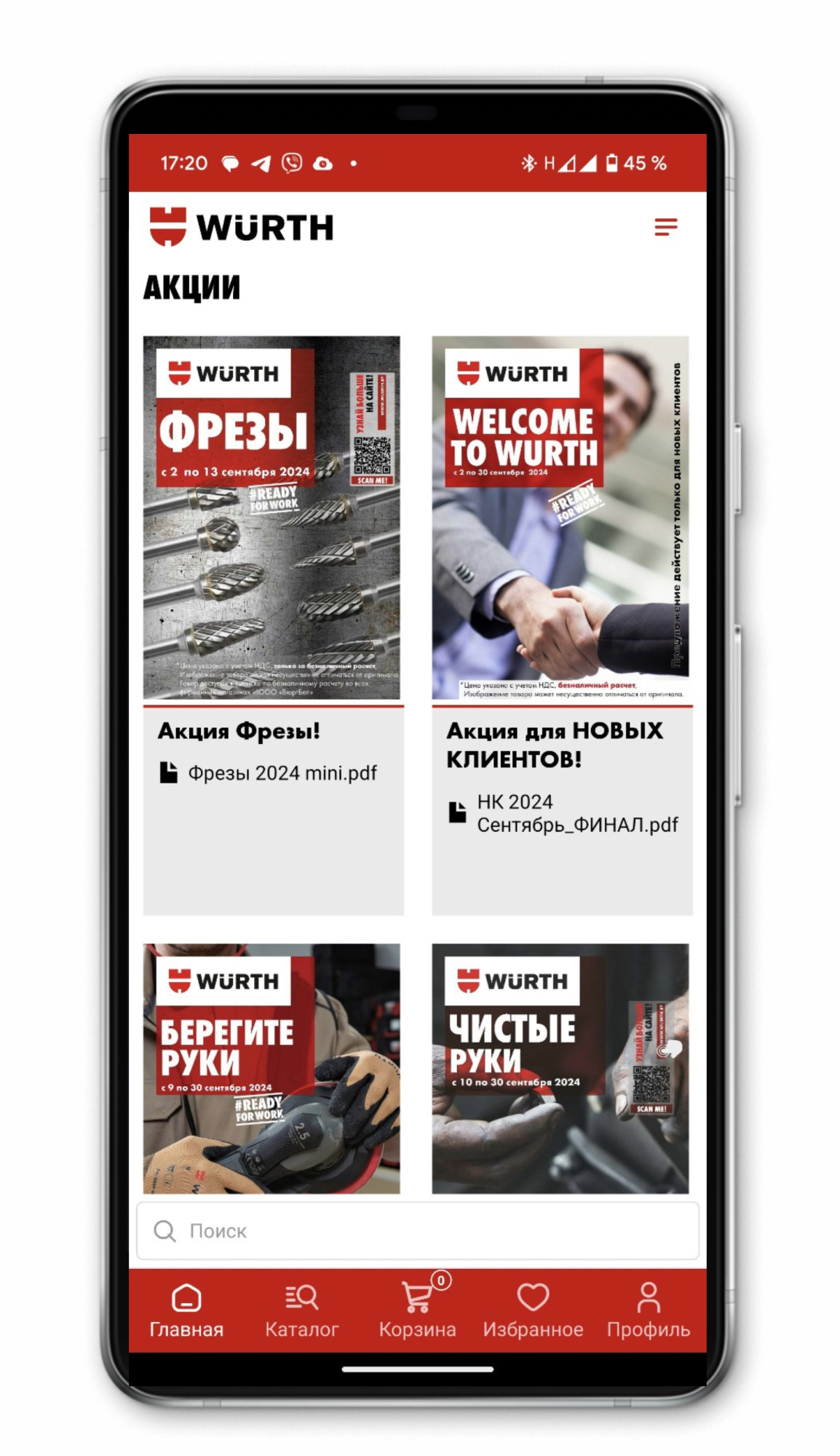 Приложение также предоставляет доступ к актуальным новинкам и лучшим акционным предложениям, а также помогает найти ближайшие филиалы Würth и получить к ним маршруты. Пользователи могут получать уведомления о новостях и акциях компании.